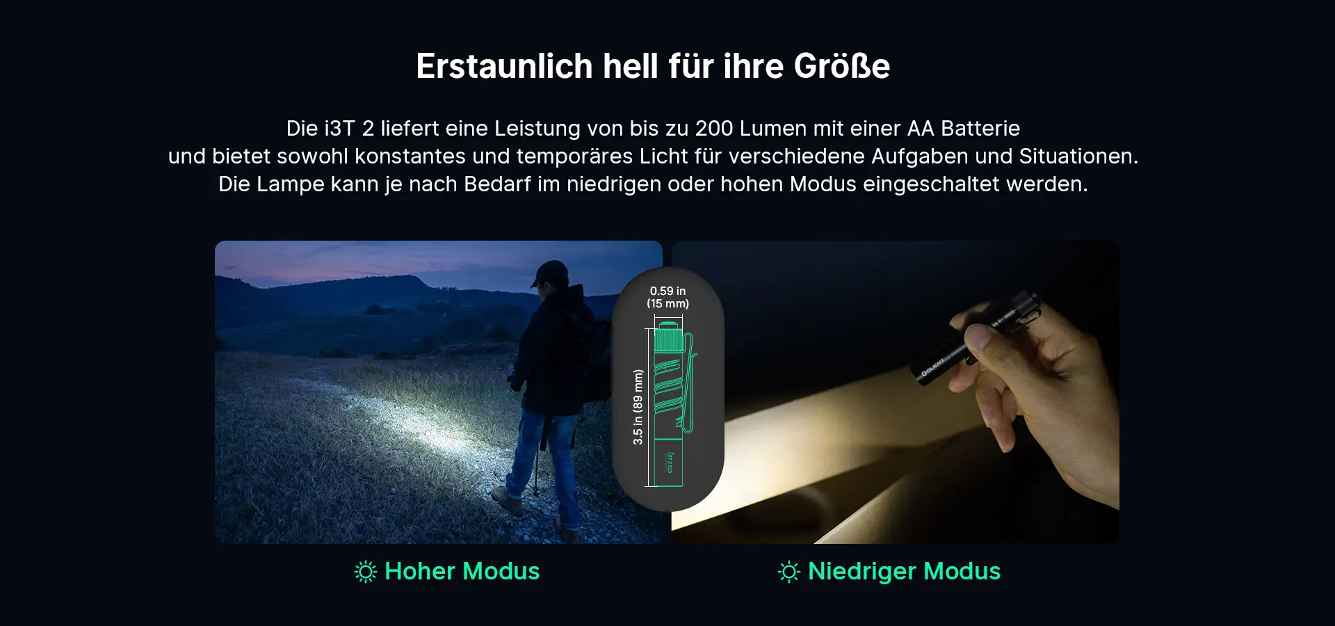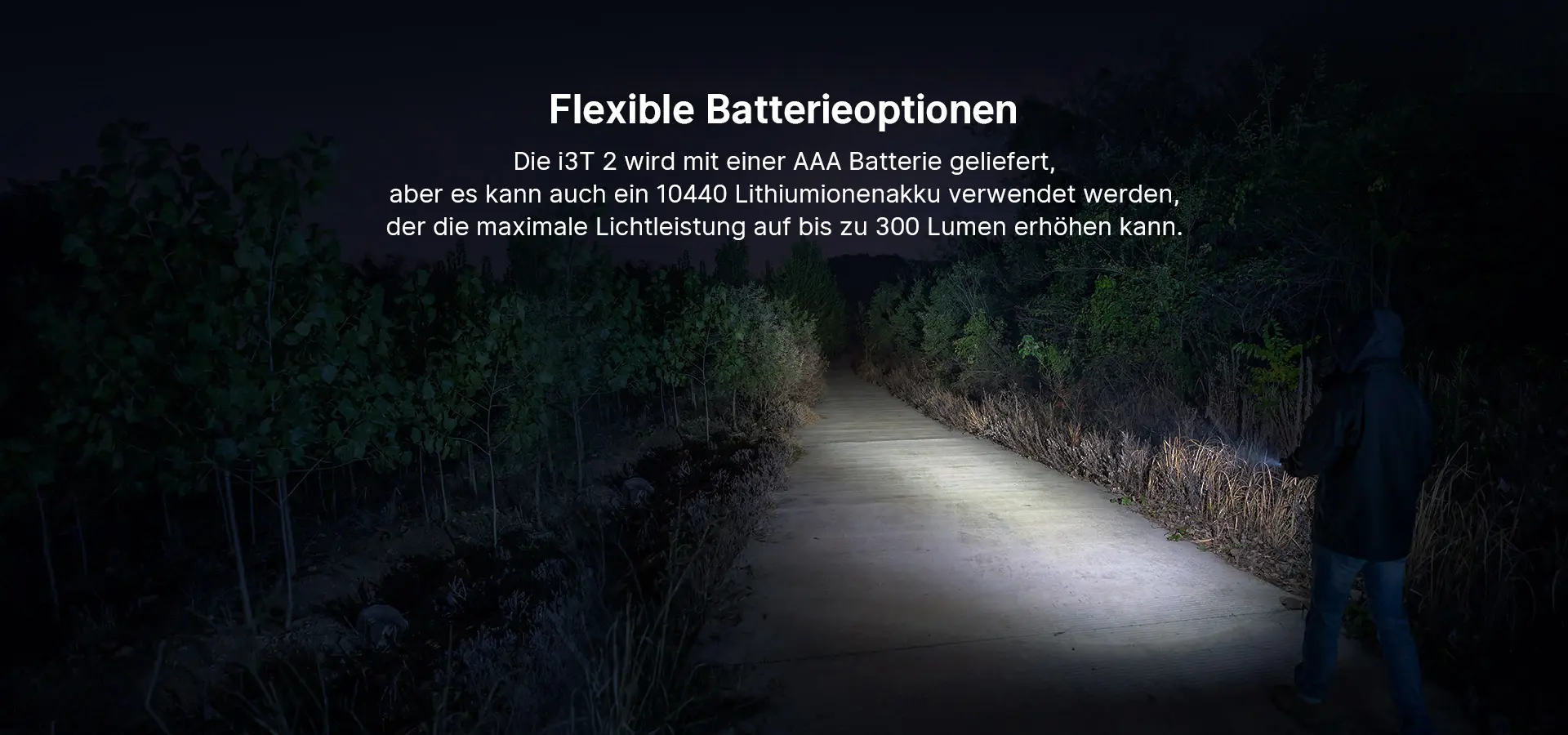 ● Flexible Energieoptionen: Neben einer AAA Alkalibatterie ist sie auch mit einem 10440 Lithiumionenakku kompatibel, der die maximale Leistung auf 300 Lumen erhöht.